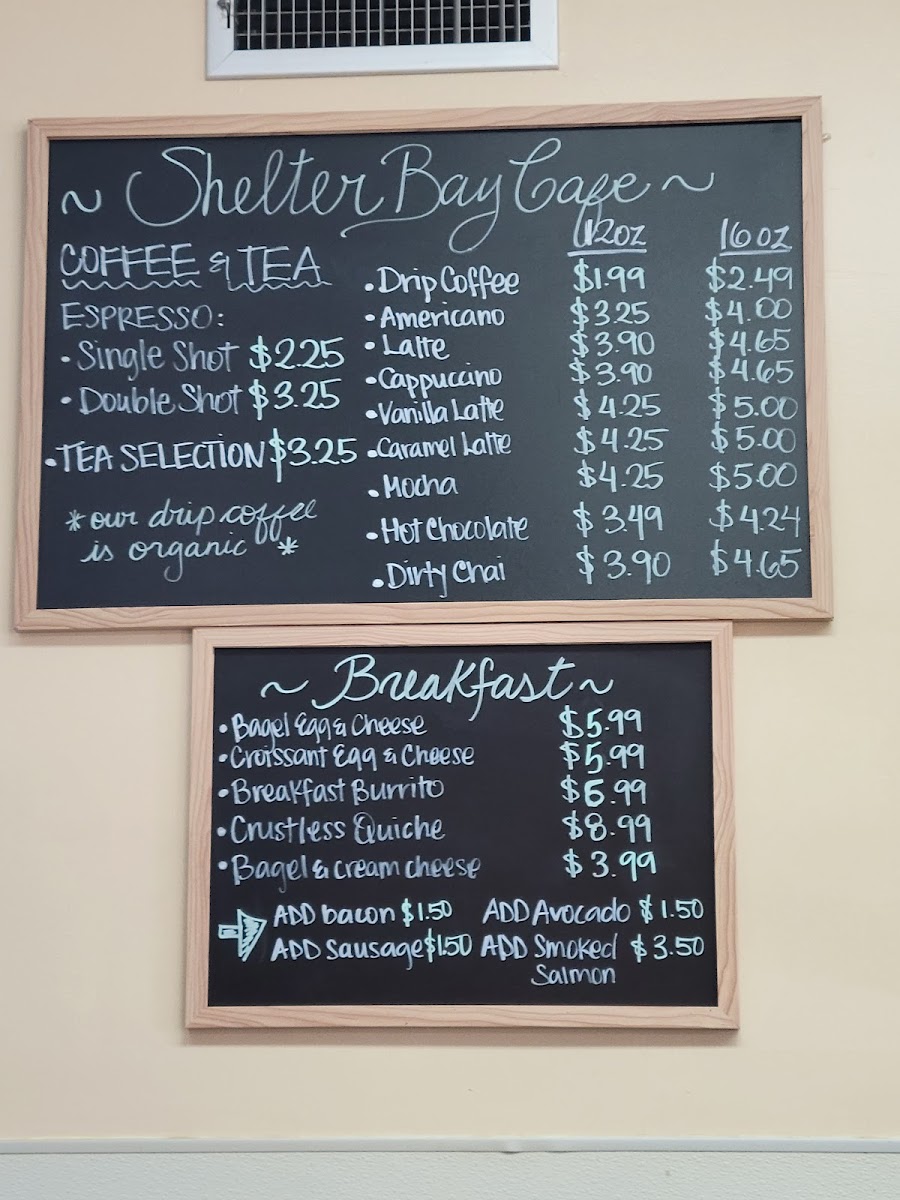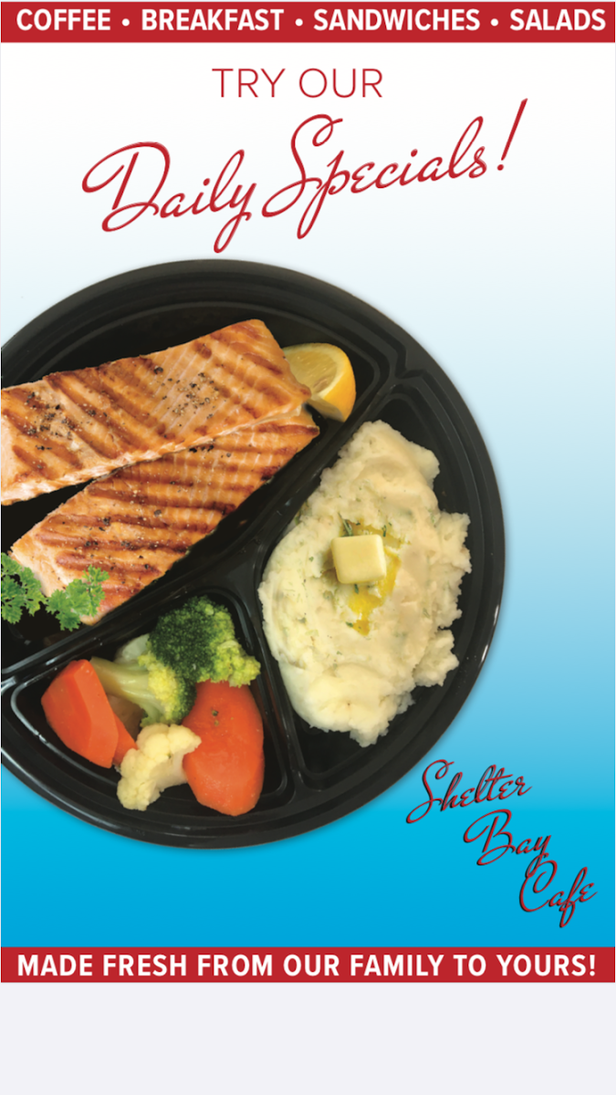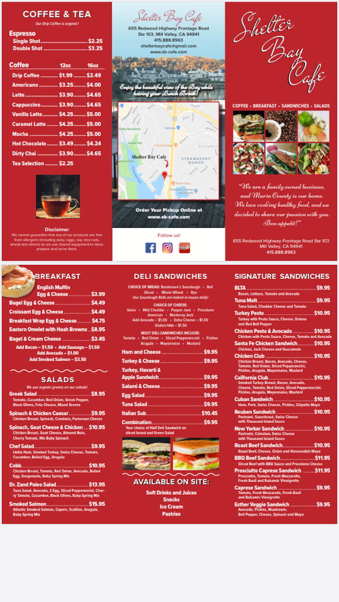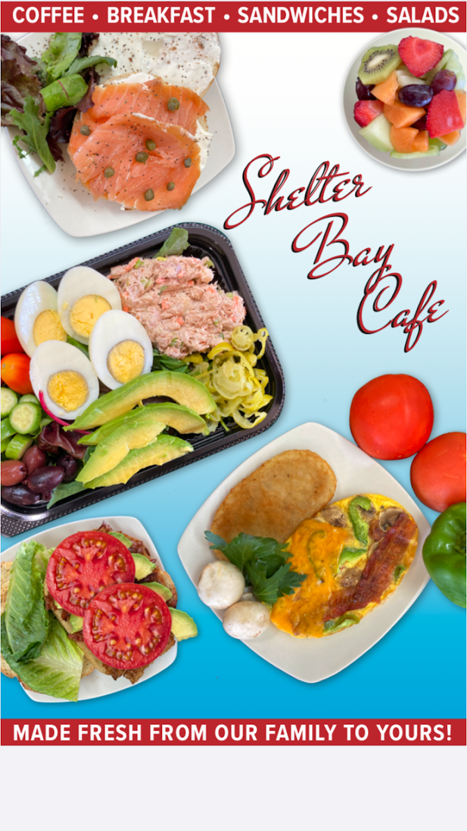 Overall, the menu at Shelter Bay Cafe offers a casual yet satisfying selection that balances classic café staples with hearty meal options. The coffee lineup is straightforward, featuring essentials like Single Shot and Double Shot espresso, along with comforting choices such as Drip Coffee, Americano, Latte, Cappuccino, and the slightly indulgent Vanilla Latte. The food menu leans into familiar favorites, with signature sandwiches like the BLTA, Tuna Melt, Turkey Pesto, and Chicken Pesto & Avocado, alongside the more robust Santa Fe Chicken Sandwich. Salads provide lighter alternatives, including the Greek Salad, Spinach & Chicken Caesar, Spinach, Goat Cheese & Chicken, Chef Salad, and Cobb, all of which feel fresh and varied. Breakfast options are particularly appealing, ranging from Egg & Cheese on an English Muffin, Bagel Egg & Cheese, and Croissant Egg & Cheese to the more filling Breakfast Wrap Egg & Cheese and Eastern Omelet with Hash Browns. The deli sandwich section rounds things out with dependable picks like Ham and Cheese, Turkey & Cheese, Turkey, Havarti & Salami & Cheese, and Egg Salad. While prices aren’t listed, the menu reads as approachable and unfussy, making it a solid choice for a relaxed breakfast or lunch stop.